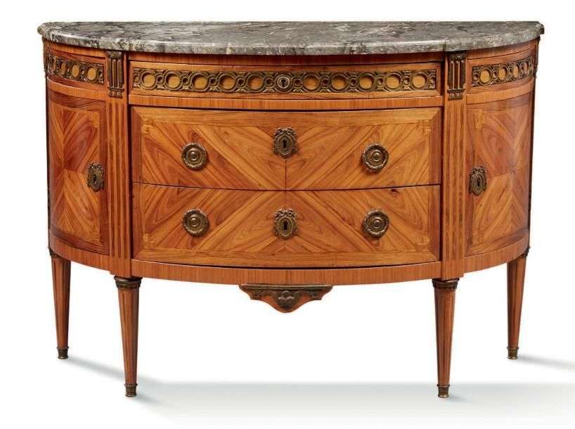 LARGE COMMODE de forme demi-lune en placage de bois de rose marqueté en ailes de papillon. Elle ouvre par trois tiroirs en façade et deux vantaux latéraux. Montants plats et pieds fuselés à cannelures simulées. Ornementation de bronzes ciselés et dorés de frises d'entrelacs. Plateau de marbre gris veiné blanc.