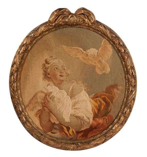 PANNEAU OVALE en tapisserie, représentant une jeune fille aux deux colombes. Encadrement en bois mouluré, sculpté et doré à décor de lauriers rubannés et d'un noeud.