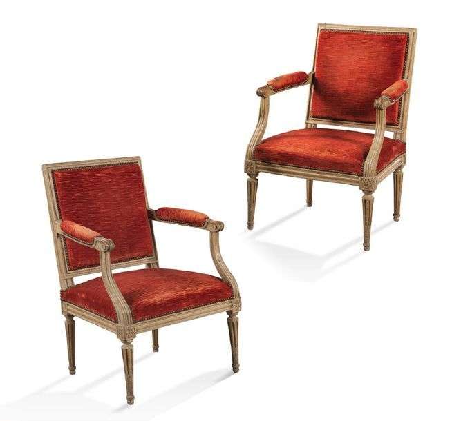 PAIRE DE FAUTEUILS en bois mouluré et laqué vert, la ceinture présente des dés de raccordement à rosaces. Ils reposent sur quatre pieds à cannelures rudentées.