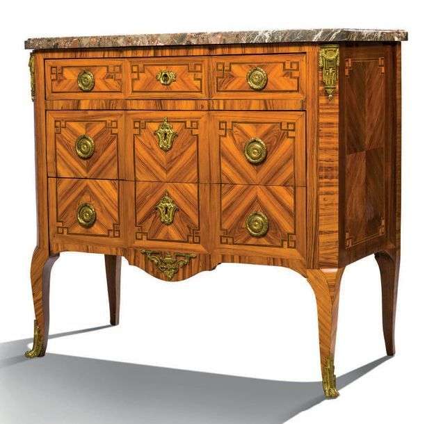 COMMODE de forme rectangulaire à léger ressaut central en placage de bois de rose dans des encadrements de filets à grecques. Elle ouvre par trois tiroirs en façade, montants plats et pieds cambrés. Ornementation de bronzes ciselés et dorés. Plateau de marbre brèche.