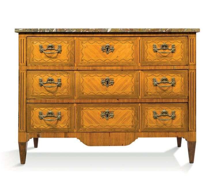 COMMODE en placage de satiné et marqueté de filets de bois teintés vert et