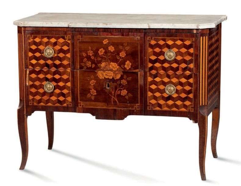 COMMODE RECTANGULAIRE à léger ressaut central en marqueterie de bois de placage de bouquets fleuris et cubes sans fond dans des encadrements de filets à grecques. Elle ouvre en façade par deux tiroirs sans traverses. Montants à pans coupés à cannelures simulées. Elle repose sur quatre pieds cambrés. Entrées de serrures en bronzes ciselés dorés.