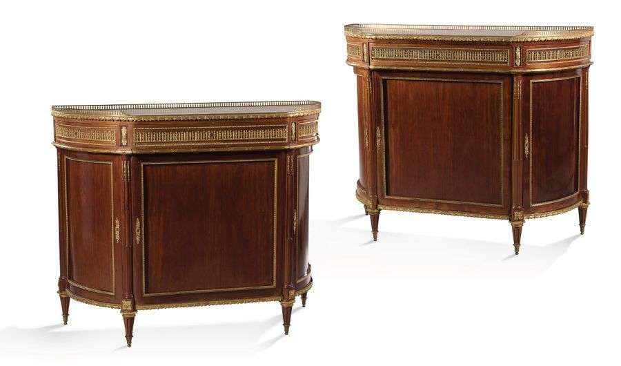 IMPORTANTE PAIRE DE BUFFETS de forme demi-lune en placage d'acajou flammé et acajou blond. Ils ouvrent en façade par trois portes et trois tiroirs rythmés par des demi-colonnes cannelées| ils reposent sur quatre pieds gaine cannelés. Riche ornementation de bronzes ciselés et dorés à motifs d'asperges, filets rubannés, draperies, rangs de perles et acanthes tel que: chutes, lingotière, entrées de serrure, filets d'encadrement, Plateaux de marbre blanc encastrés