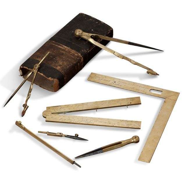NÉCESSAIRE À DESSIN COMPRENANT DES INSTRUMENTS DE MESURE en laiton ciselé.
