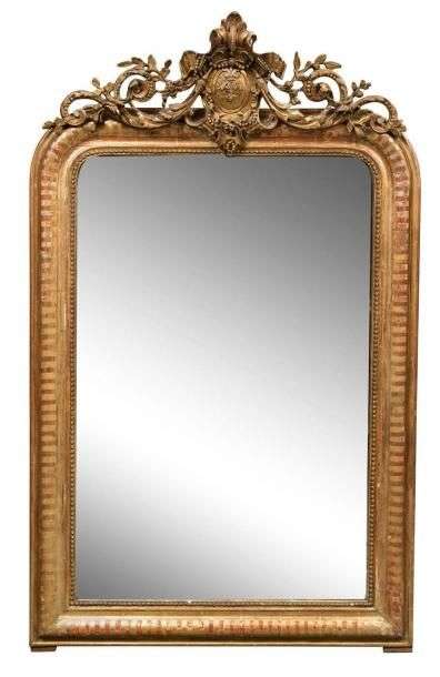 MIROIR RECTANGULAIRE en bois sculpté et doré orné d'un rang de perles. A l'amortissement, un fronton ajouré à décor de volutes feuillagées et d'un cartouche central stylisé à motif d'acanthe et de rubans.