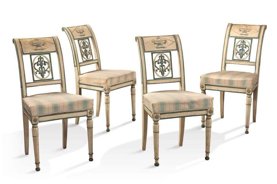 SUITE DE QUATRE CHAISES en bois laqué crème rechampi vert à dossier ajouré d'un vase à l'antique et d'une large palmette stylisée.