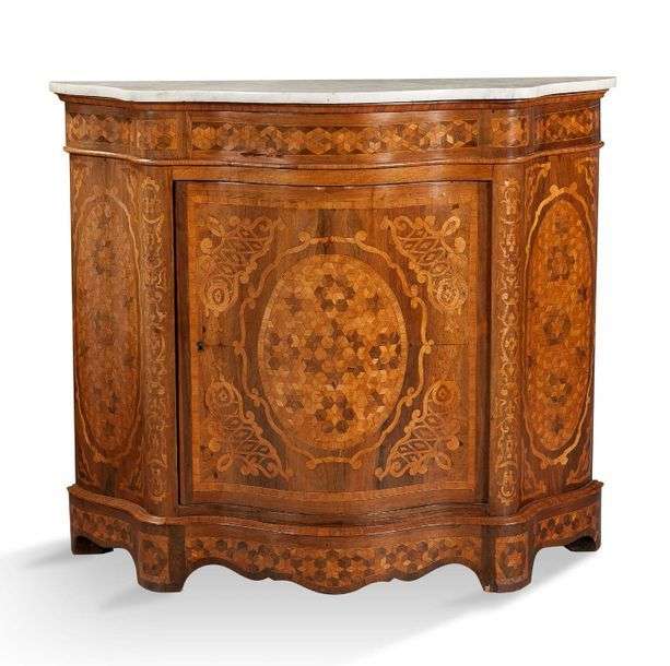 MEUBLE D'ENTRE DEUX À FAÇADE CINTRÉE en marqueterie de bois divers de cube