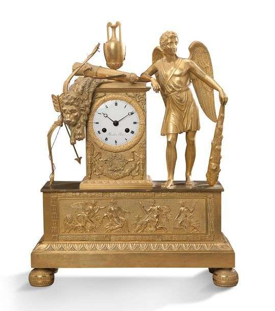 PENDULE BORNE en bronze ciselé et doré ornée de la figure d'Hercule et de ses attributs. Elle repose sur une base rectangulaire à décor en applique d'une frise de personnages antiques. Quatre pieds toupies.