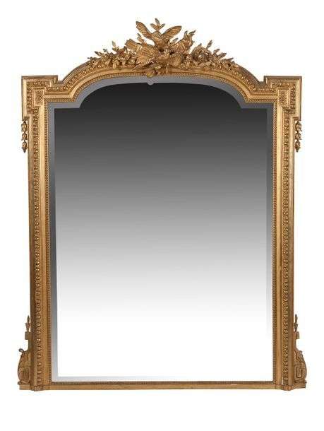 MIROIR DE CHEMINÉE RECTANGULAIRE en bois sculpté doré à décor de frises d'oves et rang de perles surmonté d'une colombe.