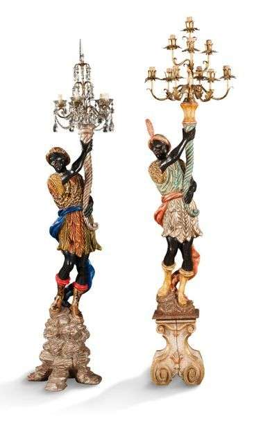 DEUX MAURES PORTE-TORCHÈRES tenant des bras de lumière en bois polychrome.