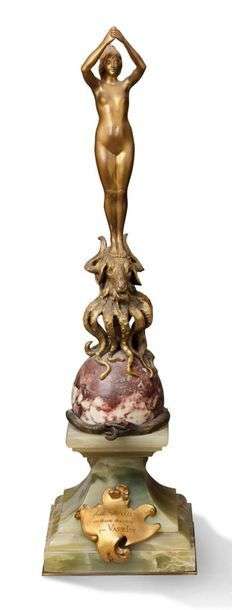 Sculpture en bronze doré et marbre rouge veiné blanc| sur une base en onyx