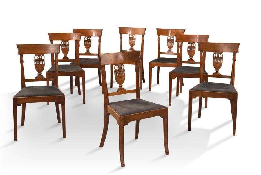 SUITE DE HUIT CHAISES en bois naturel, le dossier ajouré d'un vase à l'antique.