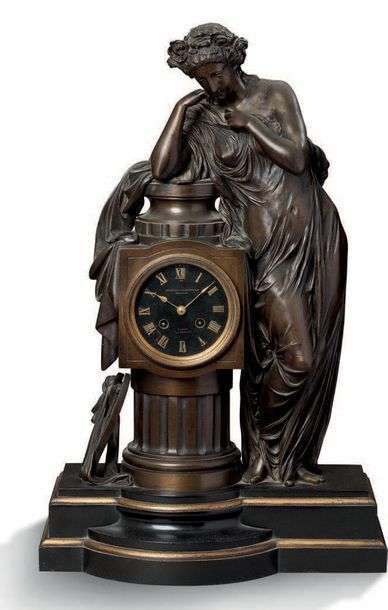 IMPORTANTE GARNITURE DE CHEMINÉE en bronze à patine brune et marbre noir composée d'une pendule représentant une femme à la lyre accoudée à une colonne et d'une paire de candélabres à cinq lumières.