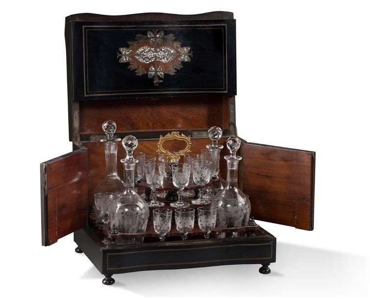 CAVE À LIQUEUR en placage de bois noirci inscrusté de nacre et de laiton comprenant quatre carafons et seize verres en cristal gravé à décor de pampres de vigne.