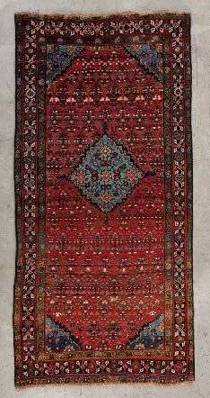 Tapis en velours et laine à champ brique à semis de botehs stylisés géométriquement en forme de becs d'oiseaux (symbole de la genèse et de la fécondité). Le motif de la graine que l'on retrouve dans les châles Cachemire encadrant un large médaillon central losangique bleu turquoise en forme de diamant stylisé. Bordure principale brique a semis de Fleurs étoilées stylisées.