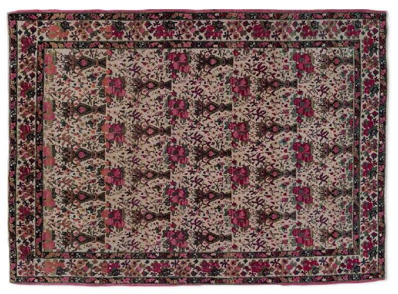 En velours en laine d'agneau, soyeuse de qualité, chaines, trame et franges en coton. Champ ivoire à semis de vases entourés de gerbes et bouquets de fleurs rubis. Trois bordures dont la principale rappelant le champ central.