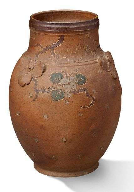 Vase en grès à décor de branchages fleuris et feuillages en relief