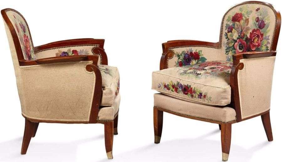 Paire de bergères en acajou verni à dossier arrondi se prolongeant sur des accotoirs pleins à manchettes plates et crosses en retrait. Elles reposent sur des pieds galbés à l'avant terminés par de sabots en bronze doré et des pieds sabres à l'arrière. Entièrement garnies d'un tissus à fleurs polychromes sur fond beige, d'aprés un carton de Paule Leleu réalisé à Aubusson par Pinton. Vers 1940