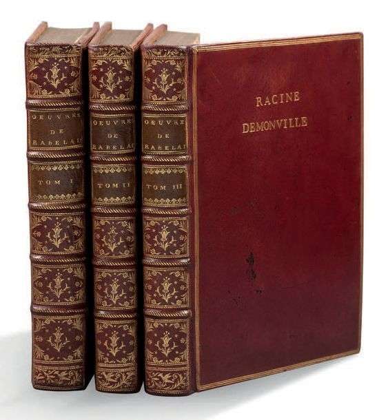 Oeuvres de Maître François Rabelais, avec des Remarques historiques et critiques de Mr Le Duchat. Nouvelle édition ornée de figures de B. Picart &..., Amsterdam, Jean Frederic Bernard, 1741. 3 volumes in-4 (235 x 180mm).