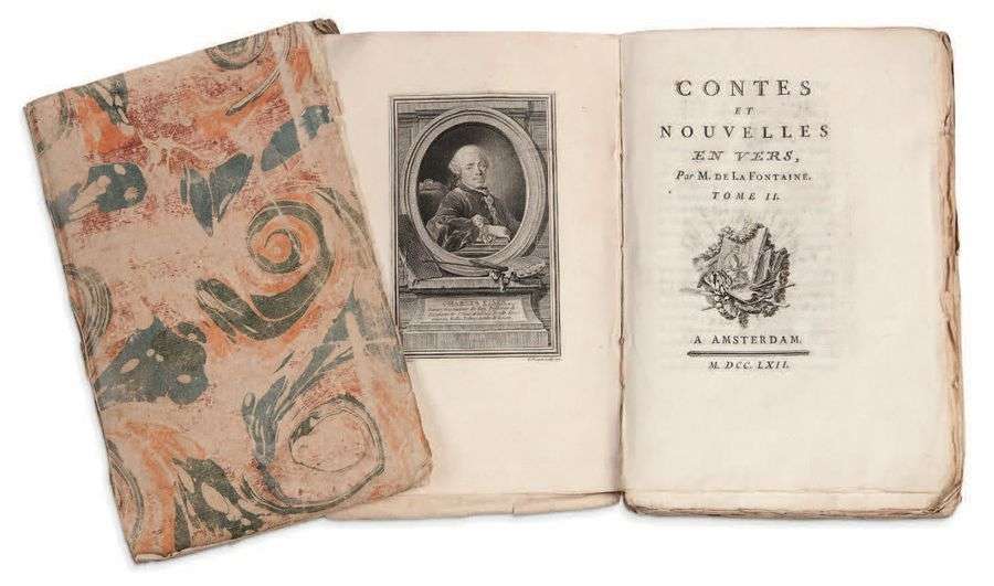 Contes et nouvelles en vers. Amsterdam [Paris], 1762. 2 volumes petit in- in-8 (205x138 mm), broché, non rogné, couverture papier marbré, chemise et étui demi-maroquin rouge moderne| dos lisse richement orné.