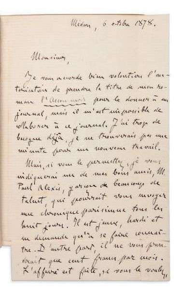 - une lettre autographe signée et datée 6 octobre 1878 d'Émile Zola adressée à un journaliste: «Je vous accorde bien volontiers l'autorisation de prendre le titre de mon roman L'Assommoir pour le donner à un journal, mais il m'est impossible de collaborer à ce journal. J'ai trop de besogne déjà.» Il recommande son ami