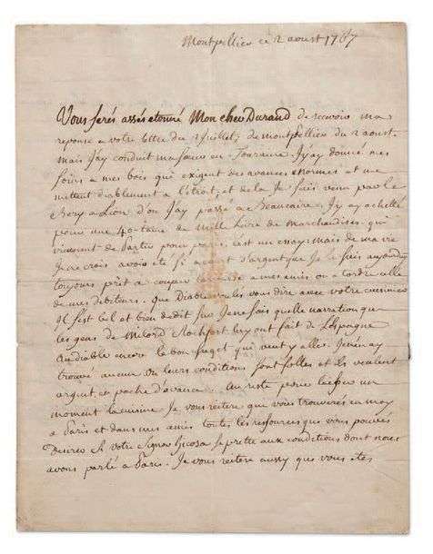 L.A.S. «Beaumarchais», Montpellier 2 août 1767, à son ami DURAND à Londres| 2 pages in-4, adresse avec cachet de cire noire (brisé) à son chiffre (légère mouillure).