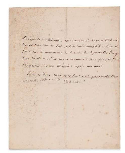 P.S. «Chateaubriand» avec apostille autographe, Paris 2 mai 1843| demi-page in-4 (rousseurs et taches, plis fendus réparés au verso).