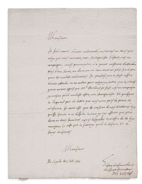 Vostre tres humble et tres obeissant serviteur Descartes» [La lettre est adressée au diplomate Joachim de WICQUEFORT (1600- 1670), diplomate, représentant de Hesse aux États Généraux, membre du Muiderkring (ou cercle du château de Muiden), ami, entre autres, des savants Grotius, Huygens et Barlæus (dont il est ici question)| en août 1640, Descartes lui avait demandé un manuscrit de Huygens.