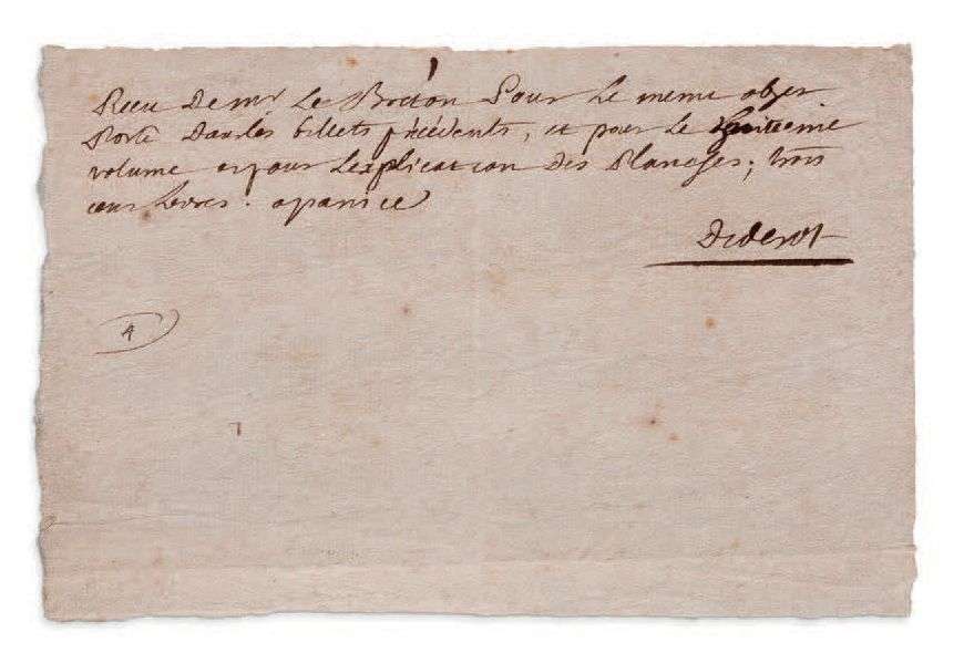 Planches| trois cent livres. A Paris ce [en blanc] Diderot» [André LE BRETON (1708-1779), éditeur parisien, fut à l'origine du projet de l'Encyclopédie, dictionnaire des sciences, des arts et des métiers, dont Diderot dirigea la rédaction en compagnie de D'Alembert.