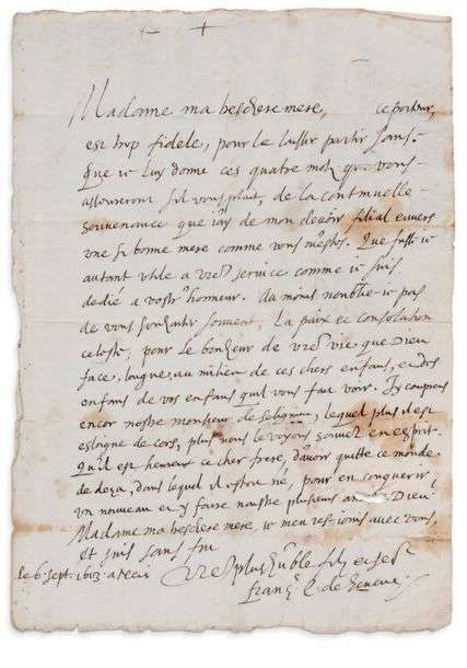 «Madame ma treschere mere, ce porteur est trop fidele, pour le laisser partir sans que je luy donne ces quatre mots qui vous asseureront sil vous plait, de la continuelle souvenance que j'ay de mon devoir filial envers une si bonne mere comme vous m'estes.