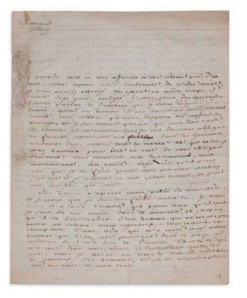 J'avois prévenu le directeur qui se croira toujours trop honoré, quand un homme d'une réputation aussi justement méritée, aussi célèbre que vous, daignera lui confier ses ouvrages| et je suis étonné que, moi qui vous doit tant de services, je me trouve dans le cas de vous obliger en fesant représenter une pièce dont les journaux m'avoient deja annoncé tout le merite. [...] Vous connoissez mon devouement, ma reconnaissance, mon amitié... Soyés sûr qu'il n'est rien que je ne fasse pour vous prouver combien j'estime et je respecte un aussi galant homme, un genie aussi sensible que vous !»