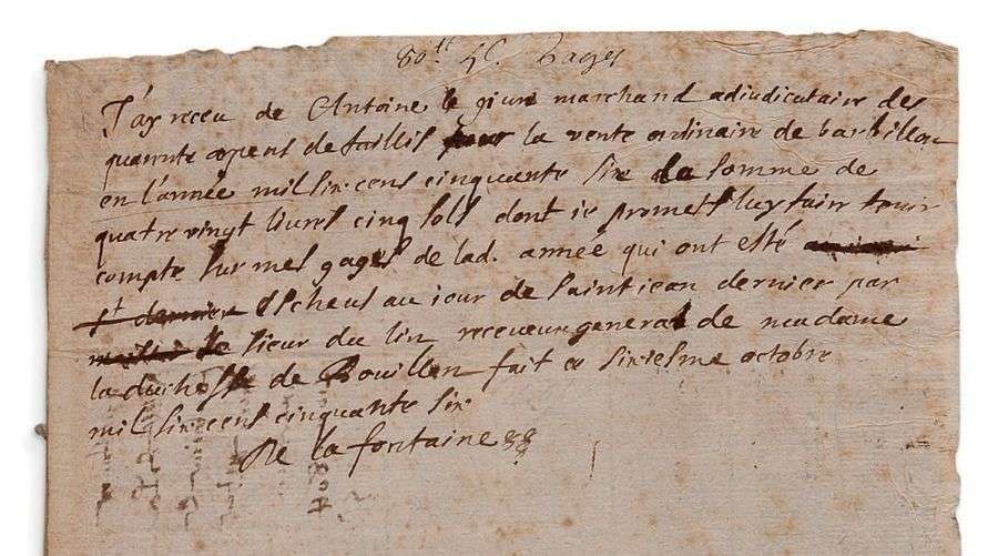 «J'ay receu de Antoine le Giun marchand adjudicataire des quarente arpens de taillis pour la vente ordinaire [du bois] de Barbillon en l'année mil six cens cinquante six la somme de quatre vingt livres cinq sols dont je promets luy faire tenir compte sur mes gages de lad. année qui ont esté escheus au jour de Saint Jean dernier par le Sieur du Lin receveur general de madame la duchesse de Bouillon. Fait ce sixiesme octobre mil six cens cinquante six»...