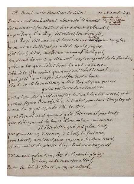 L.A.S. «Delafontaine», 28 août 1692, au chevalier de SILLERY| 3 pages in-4 (bords renforcés| un poème contrecollé au dos du second feuillet).