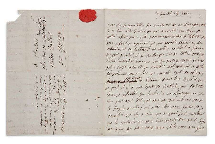 L.A., samedi 28 septembre [1771], au marquis de CONDORCET, au château d'Ablois| 3 pages et quart in-4, adresse avec cachet de cire rouge aux armes (petite déchirure à un coin par bris de cachet).