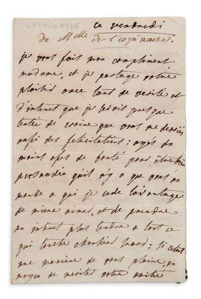 SUARD à l'Académie Française (7 mai 1772): «je partage votre plaisir avec tant de verité et d'interet que je serois presque tentée de croire que vous me devriés aussi des felicitations| ayés du moins asses de bonté pour être bien persuadée qu'il n'y a que vous au monde a qui je cede l'avantage de mieux aimer, et de prendre un interet plus tendre a tout ce qui touche Monsieur