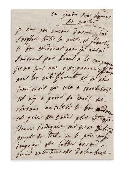 «Je n'ai pas encore dormi, j'ai souffert toute la nuit, et j'avertis le bon Condorcet que je n'irai surement pas diner à la campagne. Je me sens une repugnance effroyable pour les indifferents et je ne trouverois que cela à Courbevois. Sil n'y a point de course de chevaux au Colisé le bon Condorcet est prié de venir plus tot que l'heure indiquée, car je ne sortirai point du tout. Je le prie aussi d'engager Mr l'abbé ARNAUD à venir entendre Mr d'ALEMBERT, il nous fera grand plaisir [...] Bon jour, ou bon soir, car je vais essayer de dormir, je me sens triste jusqu'à la mort. Oui bon Condorcet le someil eternel me seroit encore meilleur que le plaisir et la consolation que j'ai à vous voir et cependant j'en ai beaucoup. Votre bonté, votre amitié soutiennent mon ame».