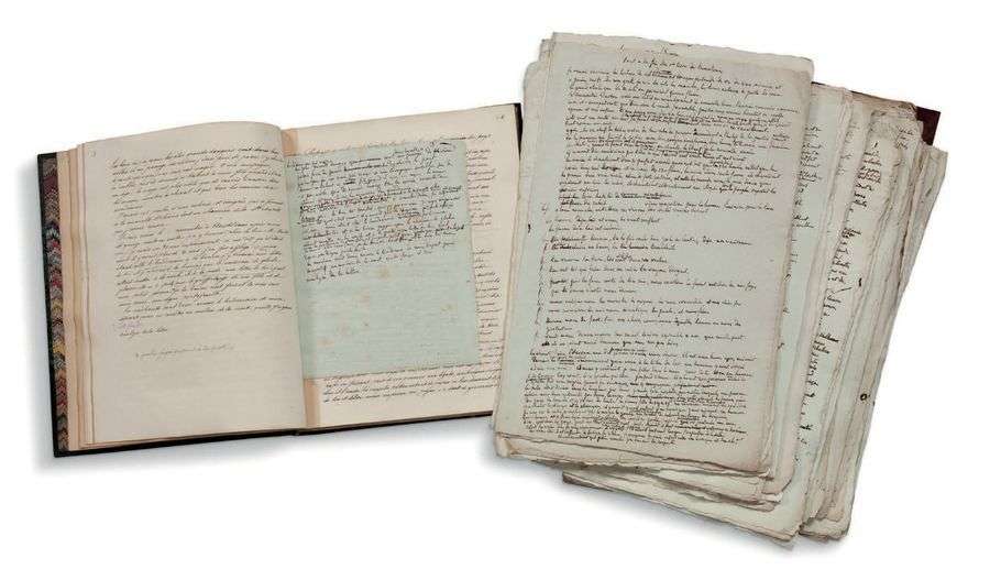 Très important ensemble de manuscrits inédits pour son roman utopique resté inachevé, L'Amazone, avec le plan détaillé, et un gros ensemble de brouillons.