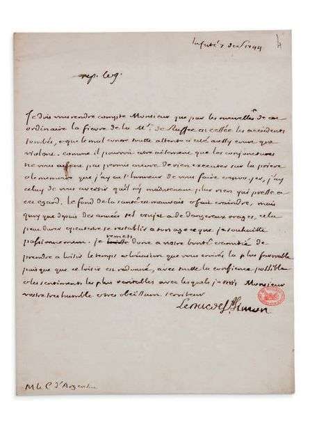 L.A.S. «Le Duc de St Simon», La Ferté 7 décembre 1744, à Marc-Pierre, comte d'ARGENSON| 1 page in-4 (petit cachet encre des Archives d'Argenson).