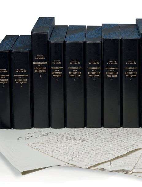 MANUSCRIT autographe, [Considérations sur la Révolution française, 1813-1817]| environ 1 400 pages in-4 (plus des ff vierges) en 18 cahiers cousus (la plupart 22 x 17 cm)| plus la copie avec corrections autographes, environ 1 200 pages in-4 en 14 cahiers| et un ensemble de brouillons, notes et copies de documents, certains en partie autographes, environ 940 pages in-4| le tout classé sous 12 chemises modernes demi-veau bleu nuit, et étuis.