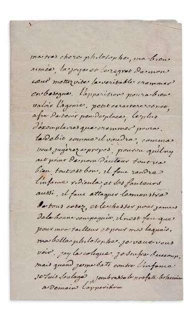 Ma belle philosophe, je veux vous voir. J'ay la colique. Je soufre beaucoup. Mais quand je me bats contre l'infame je suis soulagé.