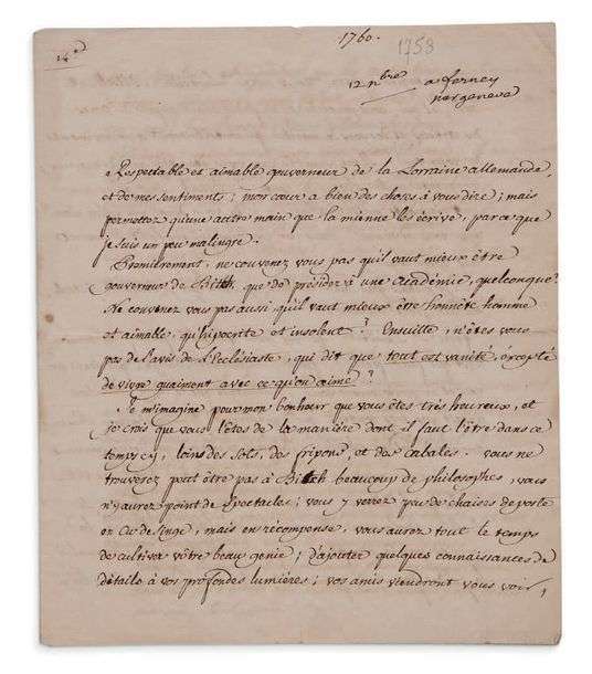 L.S. «V» avec date et 3 lignes autographes, «a Ferney par Geneve» 12 novembre [1760], au comte de