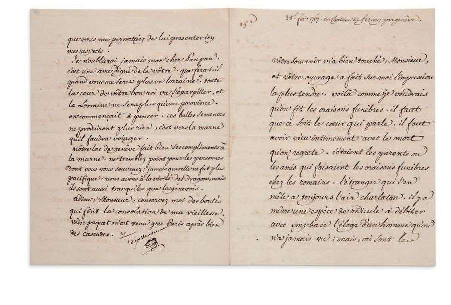 L.S. «V», Ferney 28 février 1767, au comte de TRESSAN| la lettre est écrite par son secrétaire Jean-Louis WAGNIÈRE| 4 pages petit in-4.