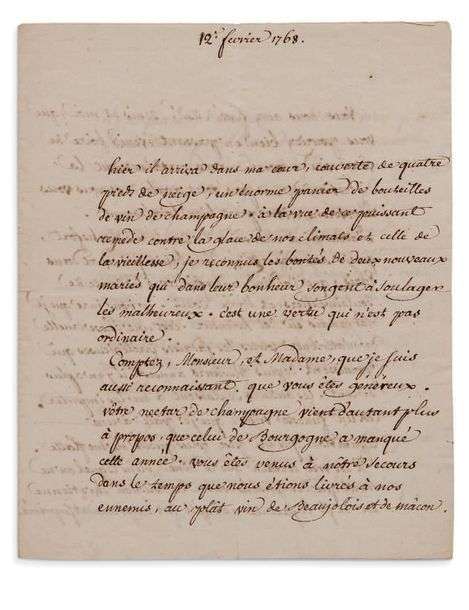 Dix neuf ans». Voltaire publia Le Dîner du comte de Boulainvilliers, dialogues philosophiques irreligieux, en décembre 1767, mais le désavoua aussitôt en l'attribuant au poète satirique Saint-Hyacinthe, mort en 1746.] «Hier il arriva dans ma cour, couverte de quatre pieds de neige, un énorme panier de bouteilles de vin de Champagne. À la vue de ce puissant remède contre la glace de nos climats et celle de la vieillesse, je reconnus les bontés de deux nouveaux mariés qui dans leur bonheur songent à soulager les malheureux. C'est une vertu qui n'est pas ordinaire. [...] Votre nectar de Champagne vient d'autant plus à propos, que celui de