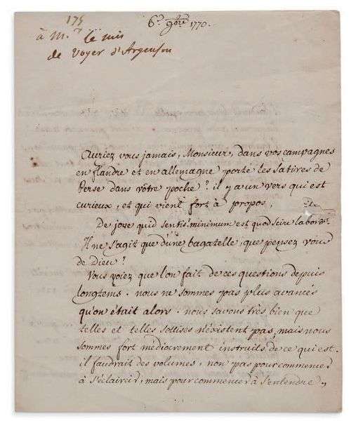 Lettre dictée, [Ferney] 6 novembre 1770, au marquis de Voyer d'ARGENSON| 3 pages in-4 (petit trou).