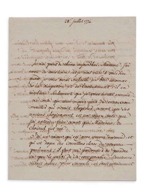 L.S. «V», [Ferney] 28 juillet 1774, à la marquise du DEFFAND| la lettre est écrite par son secrétaire Jean-Louis WAGNIÈRE| 3 pages in-4.