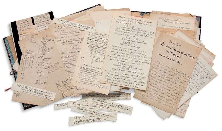 Ensemble de manuscrits, notes de lecture, fiches, relevés de hiéroglyphes, traductions, etc.