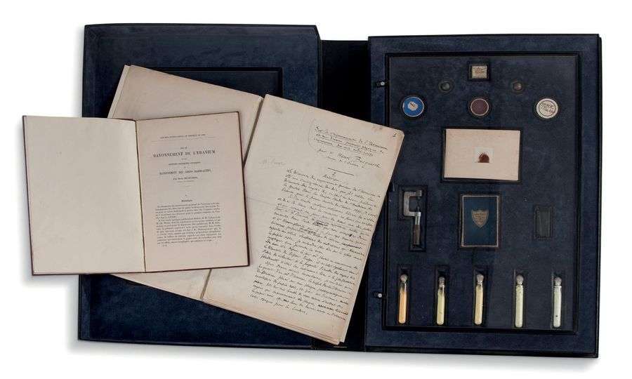 Important manuscrit scientifique résumant ses travaux et recherches sur le rayonnement de l'uranium, et la découverte de la radioactivité, parallèlement aux travaux de Pierre et Marie Curie. Il est accompagné de divers objets de laboratoire.