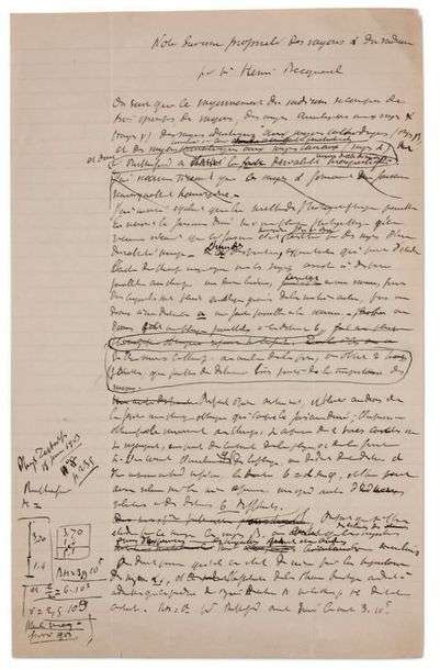 MANUSCRIT autographe signé, Note sur une propriété des rayons «du radium, [1903]| 2 pages grand in-fol.
