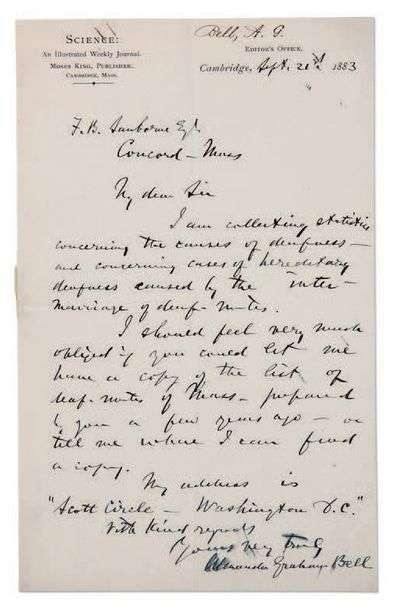 «I am collecting statistics concerning the causes of deafness - and concerning cases of hereditary deafness caused by the inter-marriage of deaf-mutes. I should féel very much obliged if you could let me have a copy of the list of deaf-mutes of