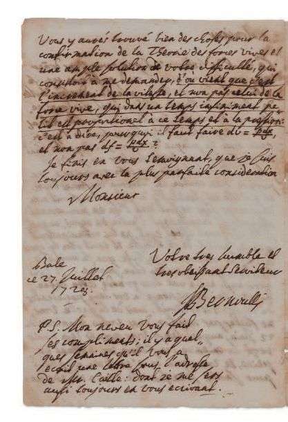 Il lui a écrit jeudi passé « quelques reflexions generales sur la piece de Mr Robins, et une reponse à l’objection tirée de l’experience avec la plaque de cuivre sur laquelle étant en oscillation on laisse tomber un poids de plomb. J’ai fait voir que cette experience ne prouve rien contre la Theorie des forces vives, et qu’elle est semblable à celle qu’on fesoit avec deux corps sans ressort dont l’un en mouvement choqueroit directement l’autre en repos, auquel si le choquant étoit egal, ne lui communiqueroit que la moitié de sa vitesse et iroit avec lui après le choc de compagnie, en sorte que la moitié de la force vive paroitra être perdue »… Il ne sait si Cramer a reçu sa très longue lettre du 23 mai : « vous y aurés trouvé bien des choses pour la confirmation de la Theorie des forces vives et une ample solution de votre difficulté, qui consistoit à me demander, d’où vient que c’est l’increment de la vitesse, et non pas celui de la force vive, qui dans un temps infiniment petit est proportionel à ce temps et à la pression : c’est-à-dire, pourquoi il faut faire du = pdx/u, et non pas df = pdx/u ? »… En post-scriptum, il transmet les compliments de son neveu [le mathématicien Nicolas Bernoulli (1687-1759)]…